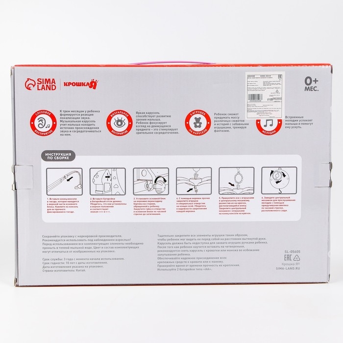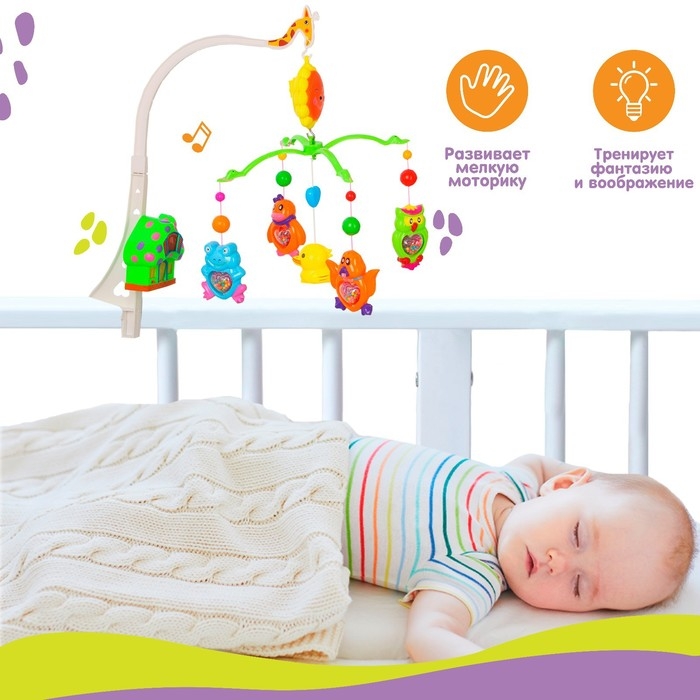 Вращающаяся музыкальная карусель поможет убаюкать малютку. Во время бодрствования грудничок будет с интересом наблюдать за движением весёлых фигурок, научится распознавать звуки, цвета и формы. Подросший малыш начнёт тянуться ручками к игрушкам: так ребёнок тренирует координацию движений и пробует оценивать расстояние до предметов.