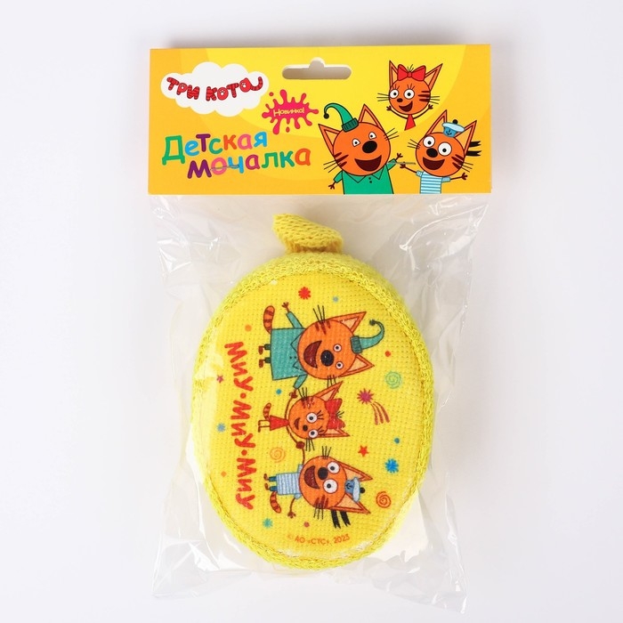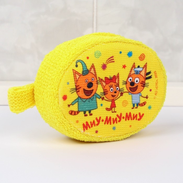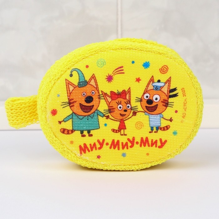 Махровая детская мочалка «Коржик» из натурального хлопка с изображением любимого героя мультсериала "Три кота". Удобный размер и форма, красочный принт.