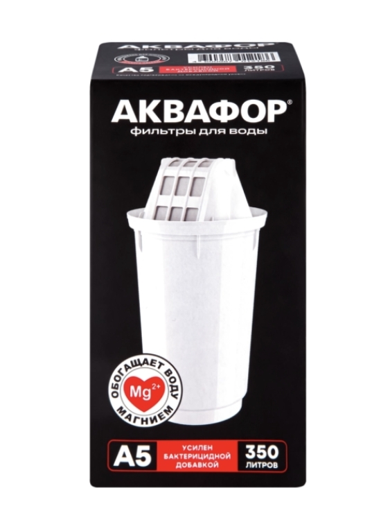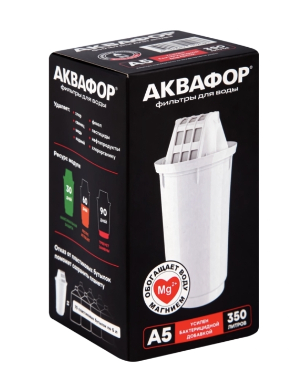 Модуль сменный АКВАФОР А5 (К-1) Материал Пластик, фильтрующая смесь Цвет (NF) Белый Размер/Формат 7,4х7,4х14,1см Вид упаковки Картонная коробка Страна Россия. Модуль сменный АКВАФОР А5 эффективно устранит вредные примеси, а также обогатит магнием воду. Особая конструкция картриджа имеет увеличенный ресурс до 350л, что позволяет дольше очищать жидкость от хлора, хлорорганических примесей, нефтепродуктов, тяжелых металлов, фенола и других токсичных соединений. Сорбционная смесь содержит компоненты, которые усиливают действие друг друга: высококачественный кокосовый уголь, ионообменную смолу и запатентованный ионообменный сорбент AqualenTM. Активные ионы серебра в микроволокне AqualenTM препятствуют росту патогенных бактерий внутри фильтрующего элемента.