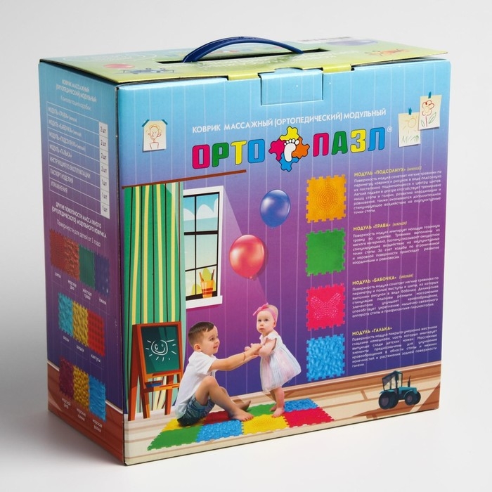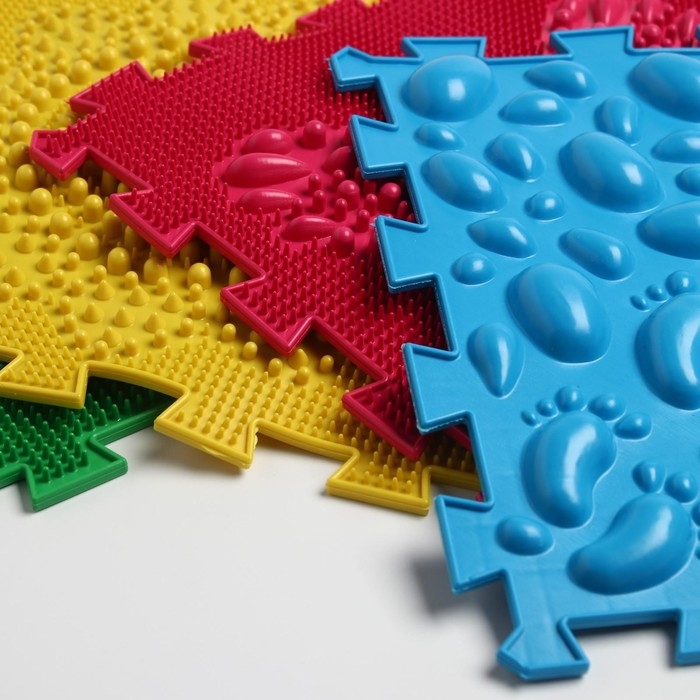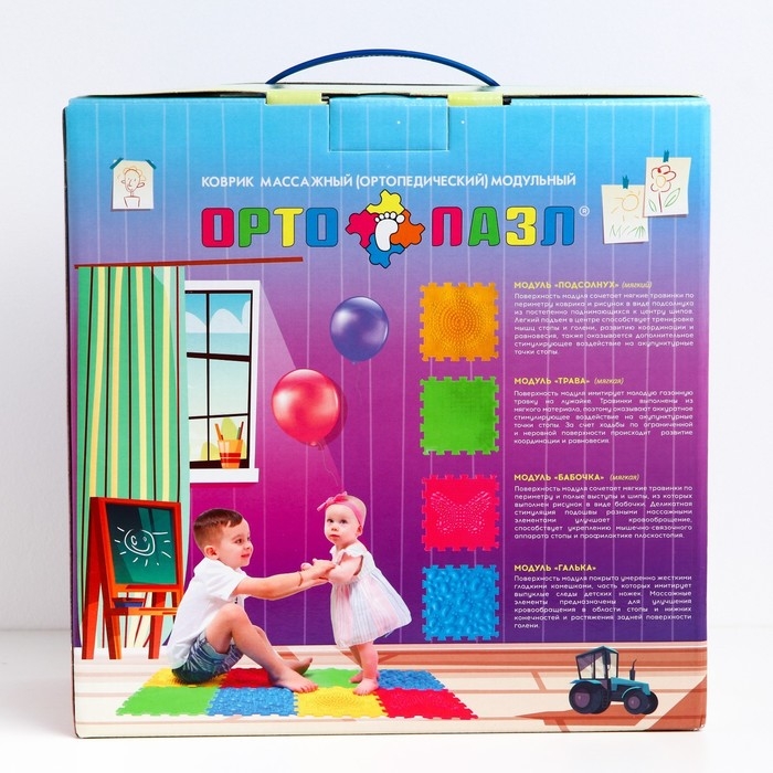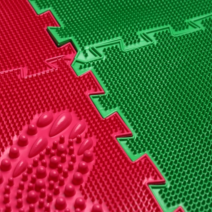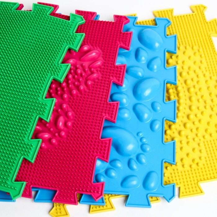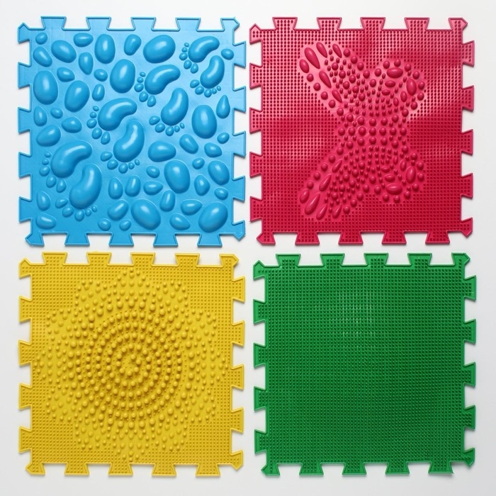 Детский массажный коврик состоит из отдельных модулей, которые соединяются между собой по принципу пазла. Ребёнок сможет ходить по рельефному покрытию или выполнять упражнения стоя на нём. Во время занятий стимулируются рецепторы стопы, формируются её физиологические своды, а также активизируется кровообращение и укрепляется связочный аппарат.