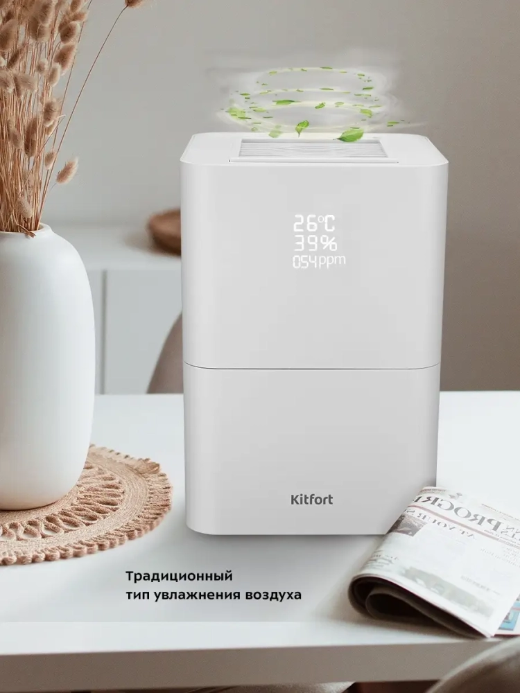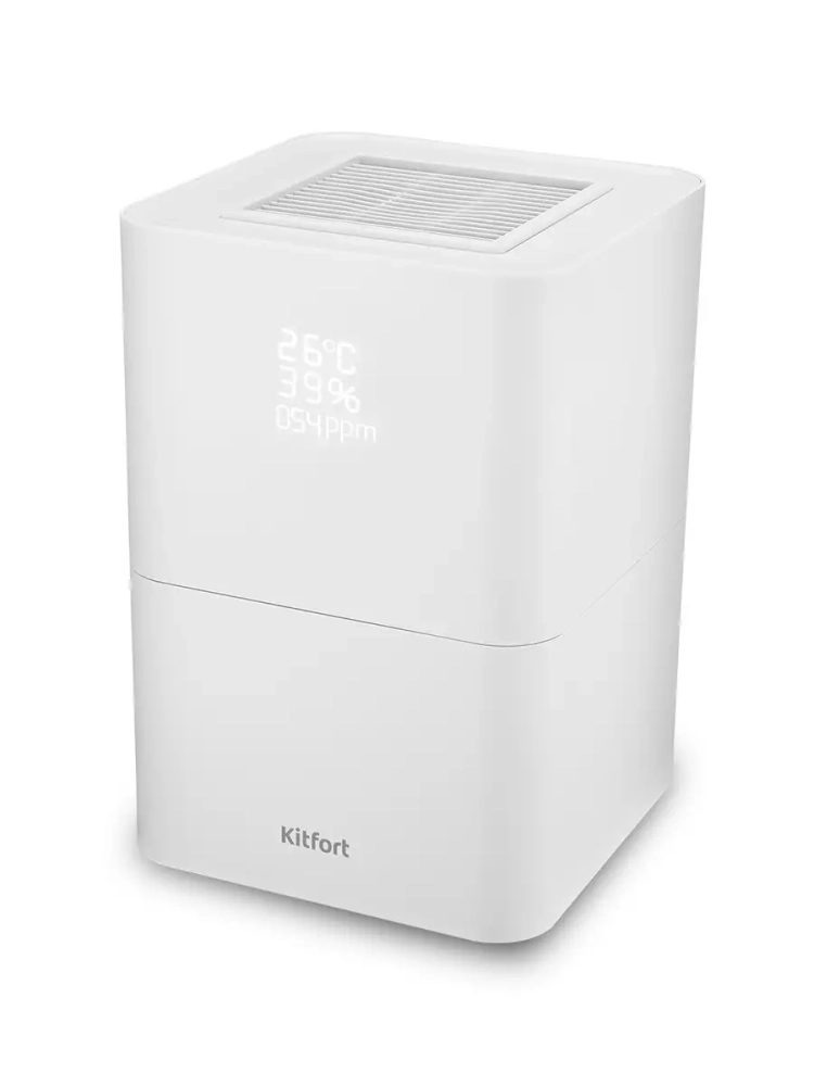 Мойка воздуха Китфорт KT-2821 увлажняет воздух в помещении, создавая хороший микроклимат для проживания людей. Она оборудована встроенными датчиками уровня влажности (гигрометром), температуры, качества воды, уровня воды и панелью управления с дисплеем.