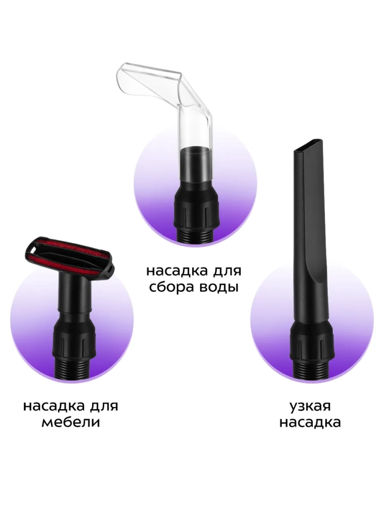 В комплекте есть узкая насадка, насадка для мебели и насадка для сбора воды, которые устанавливаются на шланг для пылесоса. Узкая насадка позволит добраться до самых труднодоступных и узких мест. Насадка для мебели справится с удалением волос, ниток и шерсти животных с мягкой мебели. Насадка для сбора воды предназначена для уборки разлитой воды.