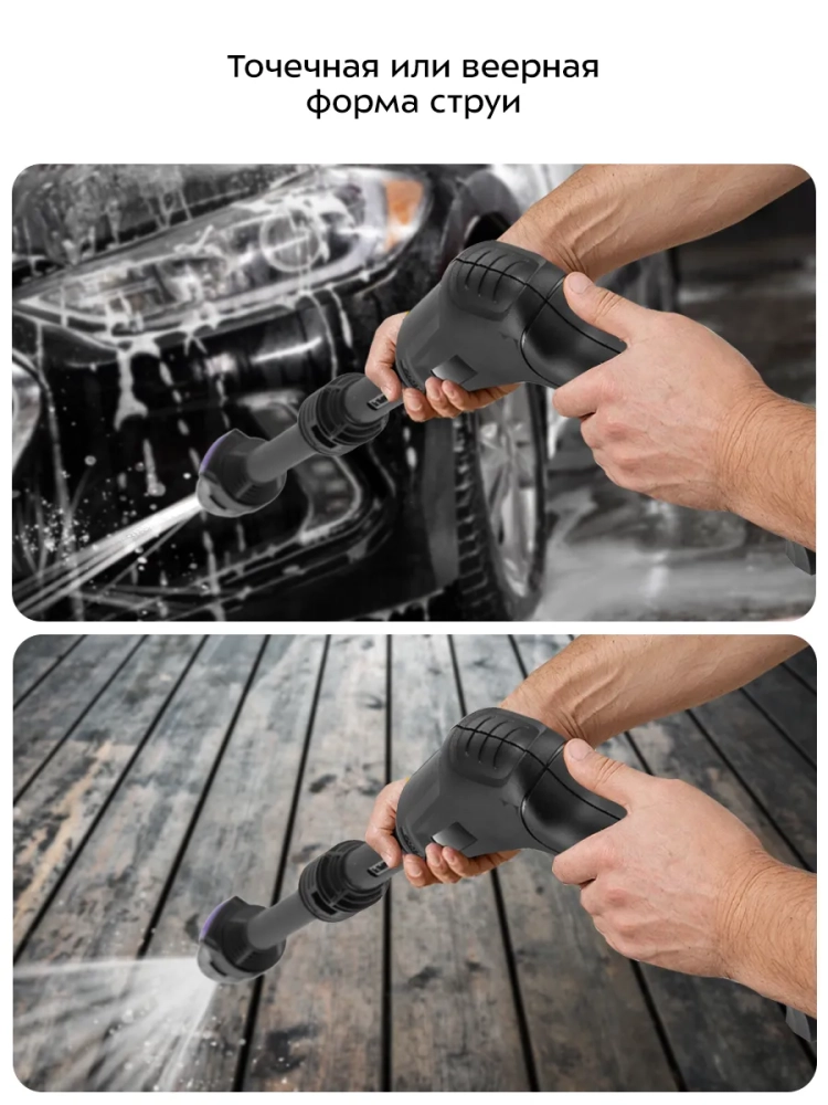 Мойка высокого давления предназначена для мытья автомобилей, садовых принадлежностей, фасадов, террас, плитки, кирпичной кладки и иных влагостойких поверхностей с помощью струи воды под высоким давлением. Насадка с регулируемым соплом позволяет выбрать точечную или веерную форму струи.