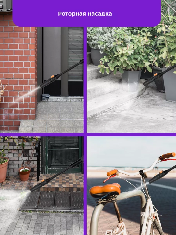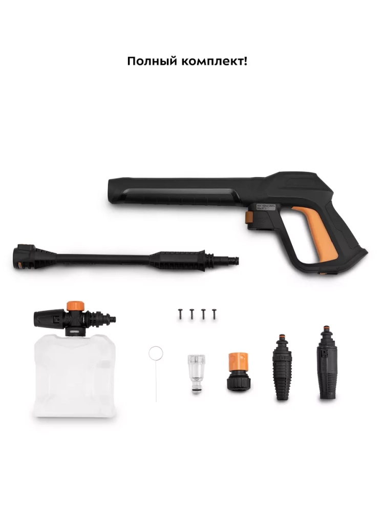 К соединительной насадке вы также можете присоединить пенную насадку с бутылкой, что позволяет быстро нанести моющее средство на очищаемую поверхность. Кроме того, в комплекте идет роторная насадка, которая обеспечивает повышенный напор воды и удаляет наиболее стойкие загрязнения.