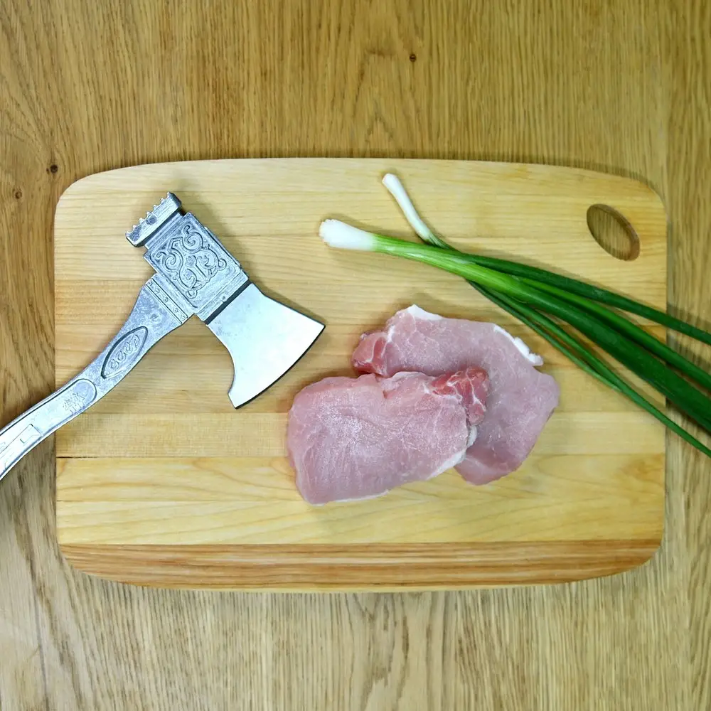 Приготовление мяса зачастую требует использования специальных приспособления. Молоток-топорик для мяса выполняет сразу 2 функции. С одной стороны располагается лезвие, которым удобно разрубать жилки, кости, отделять рыбные головы. С другой – молоток для отбивания кусочков мяса, чтобы получались сочные и нежные отбивные. Инструмент пригодится в любом хозяйстве для приготовления повседневных и праздничных блюд. Молоток-топорик выполнен в советской стилистике, понятен в использовании, удобен в хранении. Изделие необходимо тщательно мыть после каждого использования. Рабочая часть изготовлена из нержавеющей стали, ручка из алюминия. Размер: 22х11х6 см. Изготовлено из алюминия. Длина 22 см.