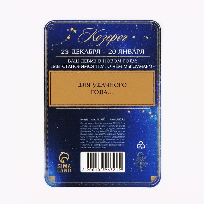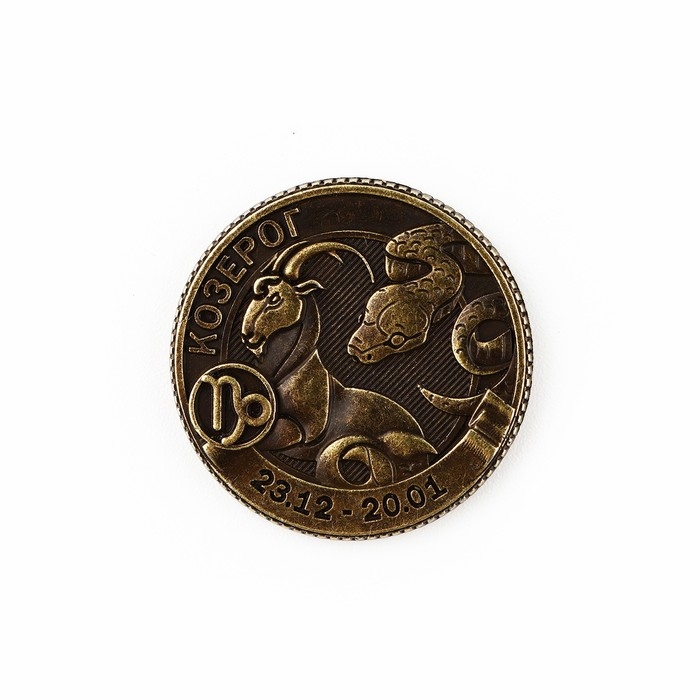 Монета новогодняя гороскоп, амулет 2025 «Новый год: Козерог», латунь, диам. 2, 5 см