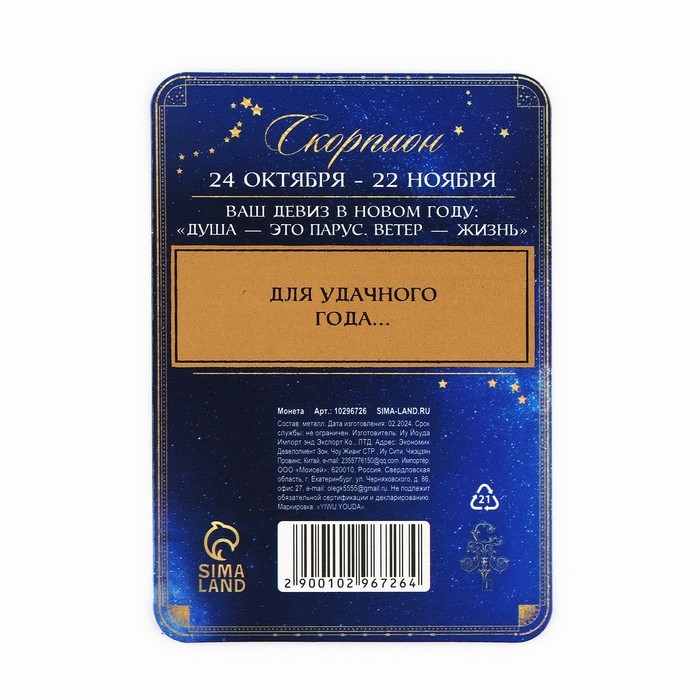 Монета новогодняя гороскоп, амулет 2025 «Новый год: Скорпион», латунь, диам. 2, 5 см