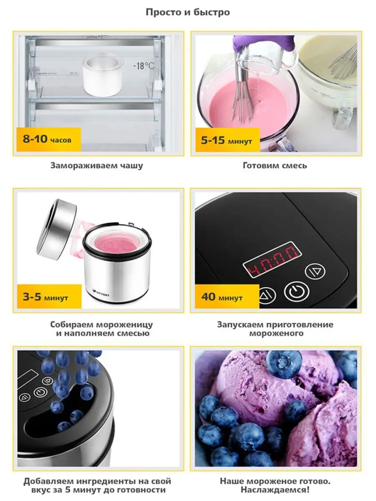Электрическая мороженица Kitfort КТ-1804 мощностью 12 Вт и объемом два литра — это идеальное решение для любителей домашнего мороженого. Этот полуавтоматический прибор позволяет делать не только классическое мороженое, но и фруктовый сорбет, джелато или замороженный йогурт из натуральных ингредиентов, ягод с сахаром. Мороженница оснащена стильным металлическим корпусом и автоматической системой смешивания, что обеспечивает равномерное распределение смеси по чаше. Принцип работы машины заключается в предварительной заморозке чаши с хладоносителем. После этого в нее добавляется заранее приготовленная и охлажденная смесь для приготовления мороженого. Запуск двигателя активирует смешивающую лопасть, которая намазывает жидкую смесь на стенки чаши для замораживания, а затем соскребает намерзшую массу обратно в центр. Это создает "снежную" структуру готового продукта. Морожница автомат Kitfort позволяет наслаждаться свежеприготовленным десертом сразу после завершения процесса приготовления или продолжить его заморозку в морозильной камере до достижения желаемой консистенции. Благодаря этому устройству вы сможете экспериментировать с различными вкусами и текстурами, готовка станет только интереснее. Фризер Kitfort КТ-1804 — это надежный бытовой помощник на вашей кухне для создания разнообразных холодных десертов. Используйте возможности этой техники Китфорт для приготовления уникальных рецептов из любимых фруктов! Мороженный продукт будет радовать вас своей нежной текстурой каждый раз.