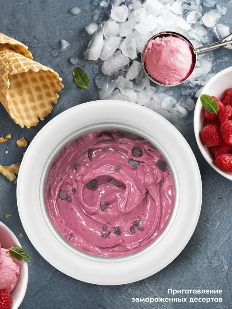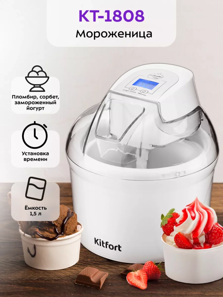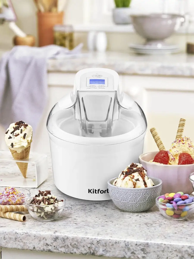 Полуавтоматическая мороженица Kitfort КТ-1808 поможет приготовить вам настоящее мороженое из натуральных продуктов, а также сорбет, джелато и замороженный йогурт. Мороженица имеет стильный пластиковый корпус, снабжена системой смешивания и имеет чашу заполненную хладагентом для охлаждения мороженого во время приготовления. Принцип работы мороженицы состоит в следующем: сначала чашу с хладагентом замораживают в морозильной камере, а затем в чашу добавляют готовую охлажденную смесь для мороженого. После запуска двигателя смесь для мороженого начинает перемешиваться лопастью и одновременно охлаждаться стенками чаши. Таким образом, происходит создание снежной структуры мороженого. Вы можете употреблять мороженое сразу после приготовления, когда оно имеет кремовую структуру, или продолжить заморозку, поместив приготовленное мороженое в морозилку на несколько часов.