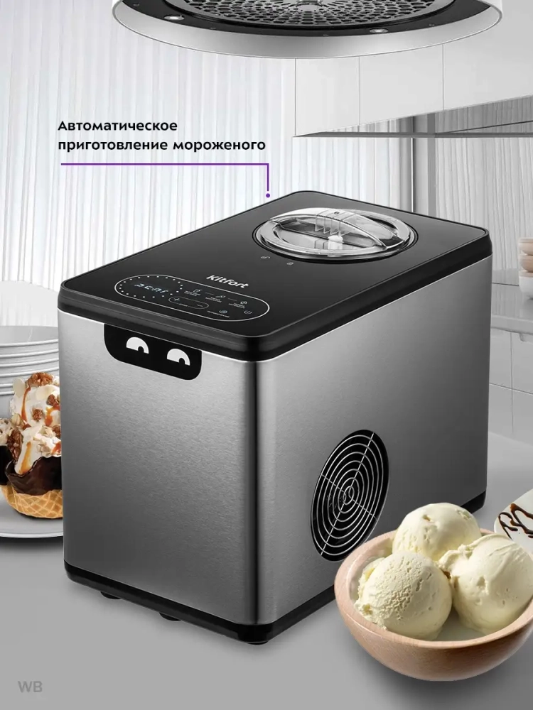 Автоматическая мороженица Kitfort КТ-1811 поможет приготовить вам настоящее мороженое из натуральных продуктов, а также сорбет, джелато, милкшейк и замороженный йогурт. Она имеет стильный металлический корпус с пластмассовыми вставками, снабжена мощным компрессором и системой смешивания. Мороженица имеет функцию поддержки низкой температуры для предотвращения таяния готового десерта. Принцип работы мороженицы состоит в следующем: компрессор охлаждает ведро с ингредиентами до отрицательной температуры, а после запуска двигателя смесь для мороженого начинает перемешиваться лопастью и одновременно охлаждаться стенками чаши. Смешивающая лопасть при совершении вращения одной стороной намазывает жидкую смесь на стенки чаши для замораживания, а другой стороной, при следующем полуобороте, соскребает намерзшую смесь. Таким образом, происходит создание "снежной" структуры мороженого. Вы можете употреблять мороженое сразу после приготовления, когда оно имеет кремовую структуру, или продолжить заморозку, поместив приготовленное мороженое в морозилку на несколько часов.