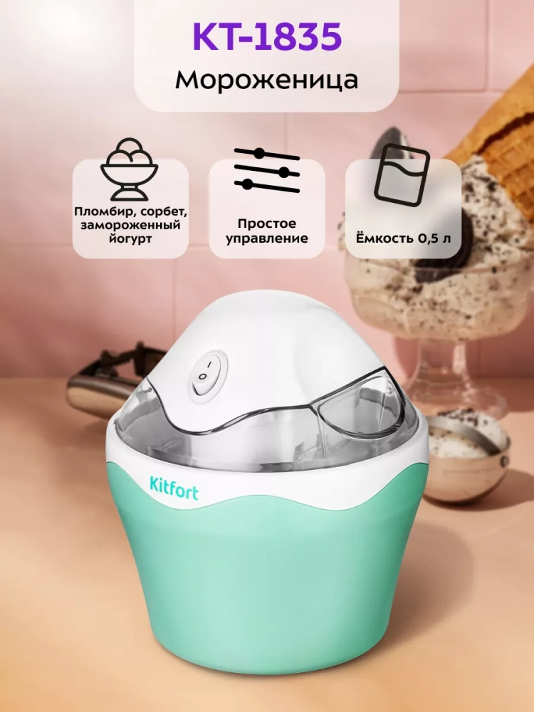 Полуавтоматическая мороженица Kitfort КТ-1835 поможет вам приготовить настоящее мороженое из натуральных продуктов, а также сорбет, джелато и замороженный йогурт. Мороженица снабжена системой смешивания и имеет чашу c хладагентом для охлаждения мороженого во время приготовления.