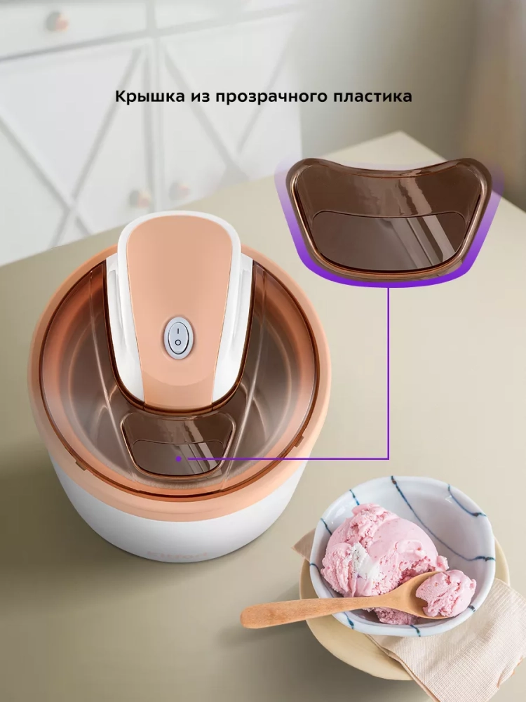 Крышка мороженицы изготовлена из прозрачного пластика, благодаря чему можно наблюдать за процессом приготовления мороженого. Для удобства добавления ингредиентов в процессе приготовления в крышке есть загрузочное отверстие. Прорезиненные ножки не дают устройству скользить по столу.