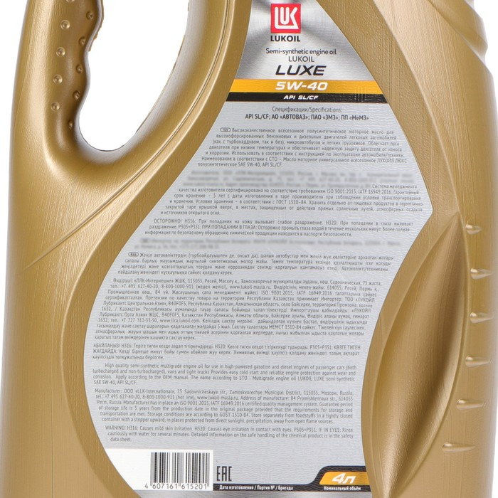 Моторное масло Лукойл Люкс 5W-40, API SL/CF, полусинтетическое, 4 л 19190