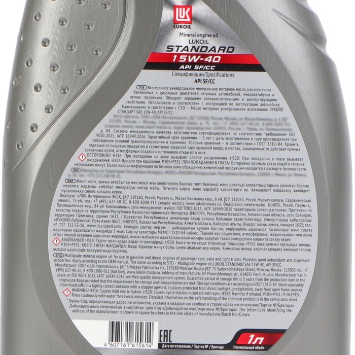 Моторное масло Лукойл Стандарт 15W-40, API SF/CC, минеральное, 1 л 19434