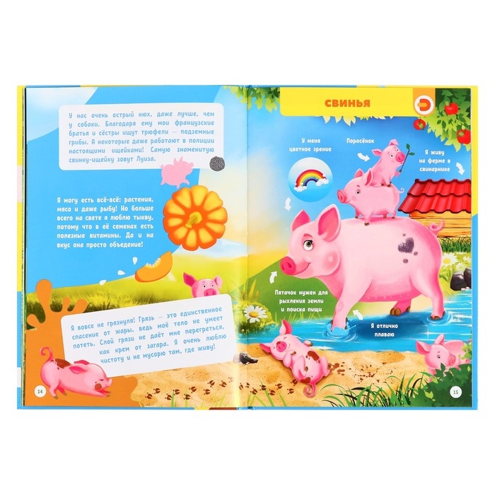 Энциклопедия «Домашние животные» — это необычный и современный подход к развитию вашего малыша. Яркая и красочная книга познакомит с животными, которые уже долгое время живут бок о бок с людьми. Ребёнок узнает, как зовут маму, папу и детёныша, как животные разговаривают между собой и как взаимодействуют с человеком. Эта книга способствует формированию речи ребёнка, развивает память, расширяет кругозор.