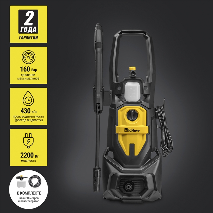 Мойка высокого давления Kolner K160, 160/110 Бар, 2200 Вт, 430 л/ч, метал.помпа, шланг 8 м