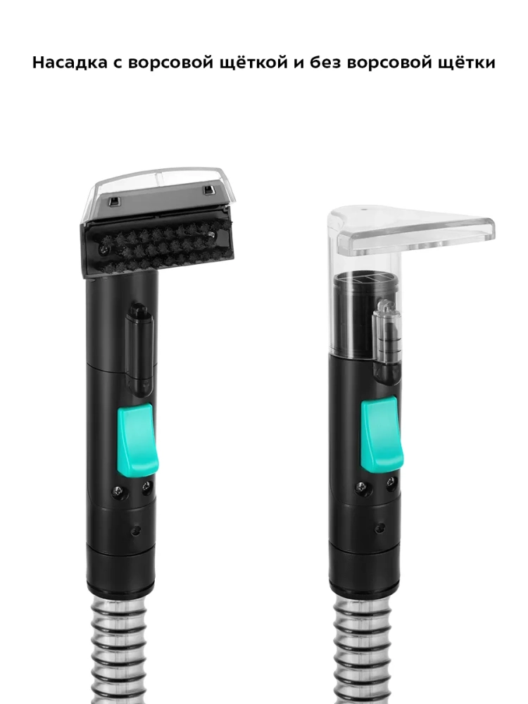 Благодаря небольшим размерам и весу моющего пылесоса его легко перемещать за ручку ближе к зоне уборки. В комплекте есть 2 насадки — с ворсовой щеткой и без. Насадка с ворсовой щеткой хорошо подходит для очистки въевшихся загрязнений. Насадка без ворсовой щетки чуть меньше и удобна для очистки труднодоступных мест или несильных загрязнений.