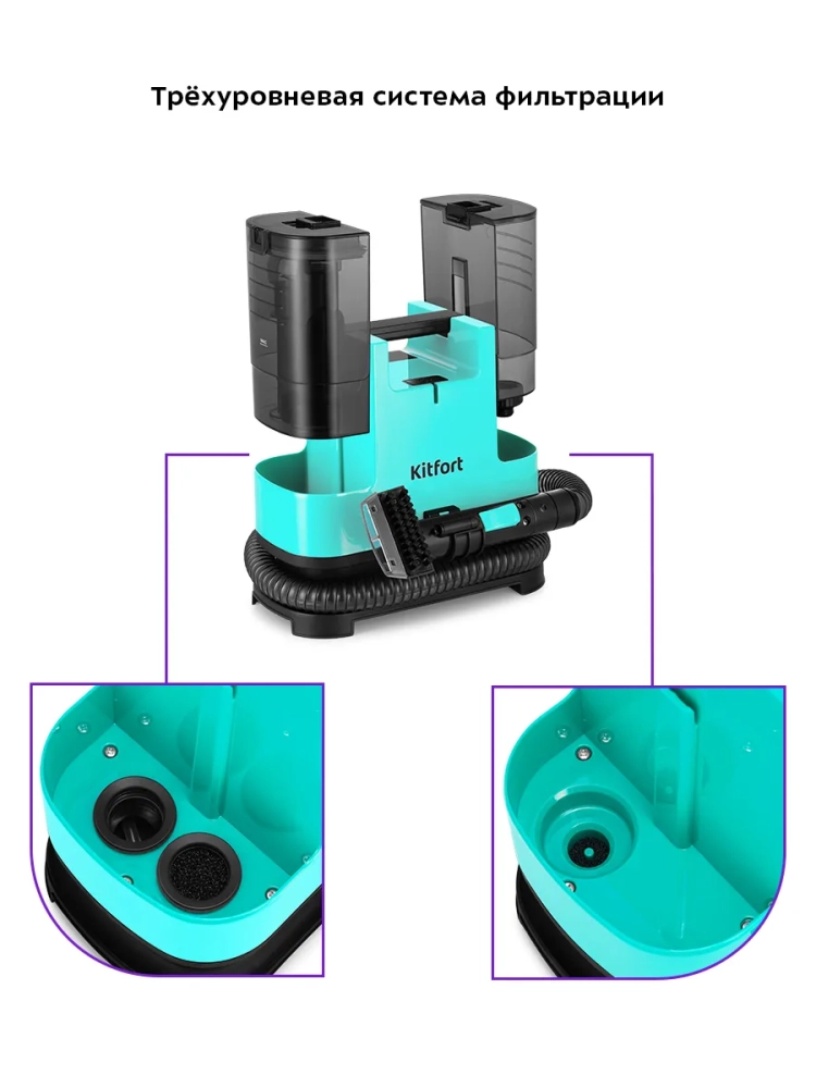 Моющий пылесос для ковров и мягкой мебели Kitfort KT-5162 поможет очистить обивку дивана, кресел, сидений в машине и другой мягкой мебели, а также ковры и ковровые покрытия. Пылесос автоматически подает чистую воду на очищаемую поверхность, а затем всасывает воду с пылью и другими загрязнениями. В резервуар для чистой воды можно добавлять только воду. В резервуаре для грязной воды предусмотрен поплавок, который по мере наполнения резервуара поднимается.