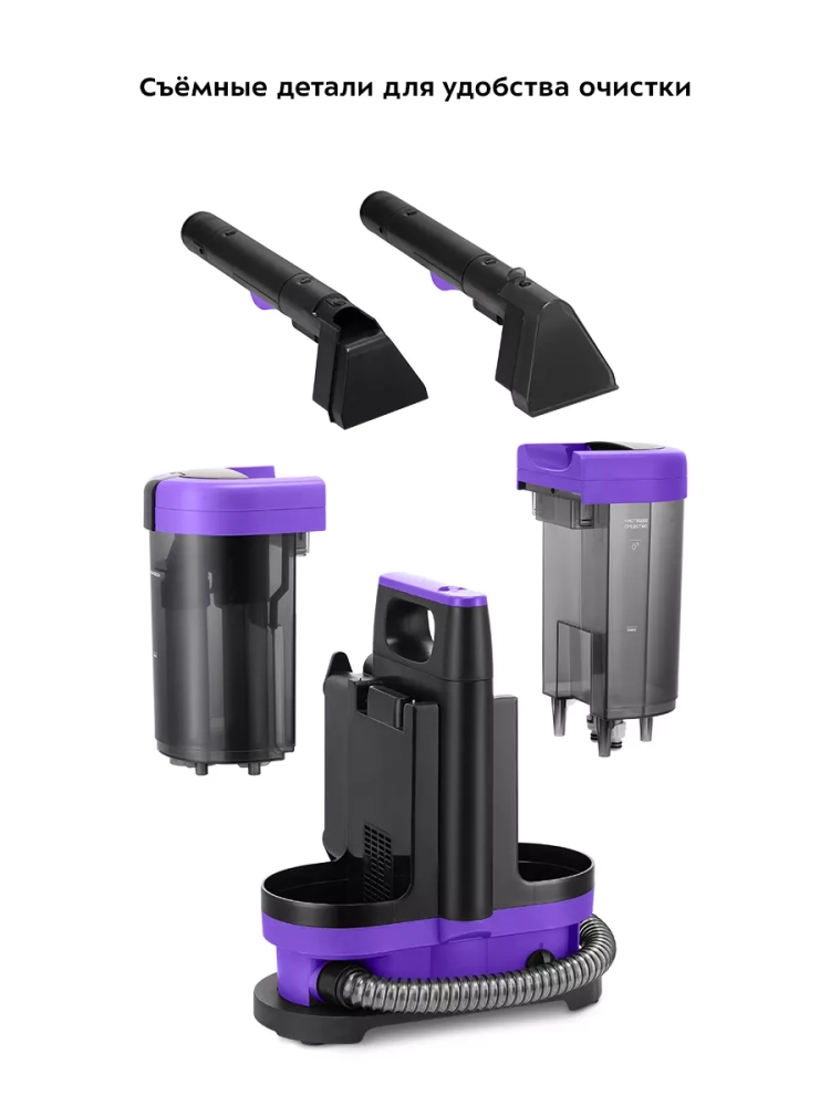 Чистить пылесос очень легко, так как насадки и резервуары снимаются и промываются проточной водой. Для очистки шланга предусмотрена специальная насадка для чистки.