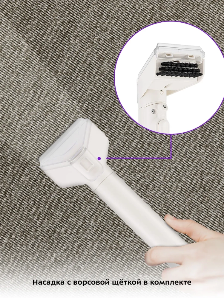 В комплекте поставляется насадка с ворсовой щеткой. Она хорошо подходит для очистки въевшихся загрязнений и ковровых покрытий. Крышка насадки и резервуар для грязной воды выполнены из прозрачного пластика, поэтому в процессе уборки хорошо видно, как много грязи собирает моющий пылесос.