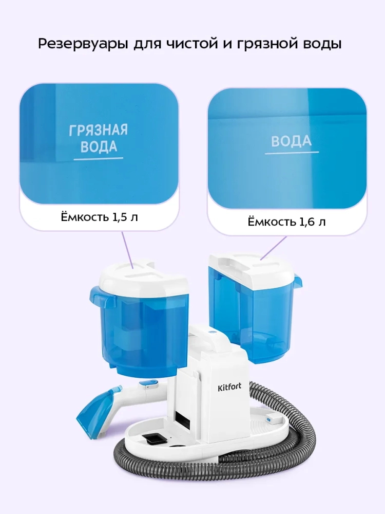 Беспроводной моющий пылесос Kitfort KT-5376 поможет очистить обивку дивана, кресел, сидений в машине и другой мягкой мебели, ковры и ковровые покрытия, а также гладкие поверхности, например, окна или зеркала. Пылесос автоматически подает чистую воду на очищаемую поверхность, а затем всасывает воду с пылью и другими загрязнениями. Пыль и грязь оседают в воде в резервуаре для грязной воды. В резервуар для чистой воды можно добавлять воду или воду со специальным чистящим средством. В резервуаре для грязной воды предусмотрен поплавок, который поднимается по мере наполнения резервуара. Когда резервуар для грязной воды будет наполнен выше максимально допустимого уровня, поплавок перекроет всасывающее отверстие и защитит двигатель от попадания влаги, после чего пылесос перестанет всасывать жидкость. Отключите пылесос и вылейте грязную воду из резервуара.