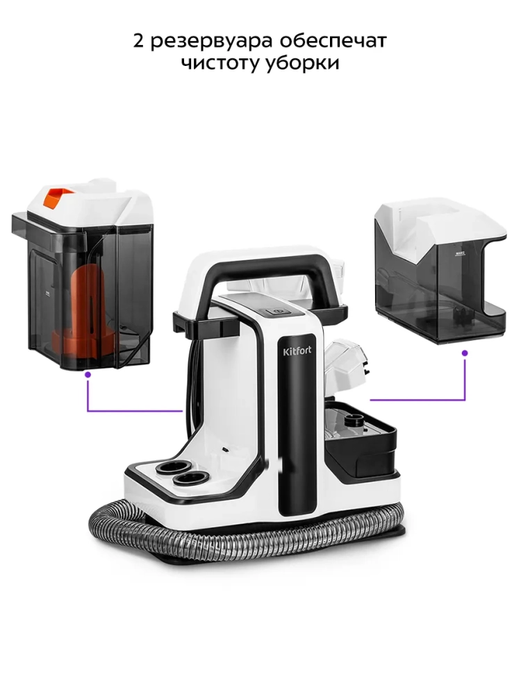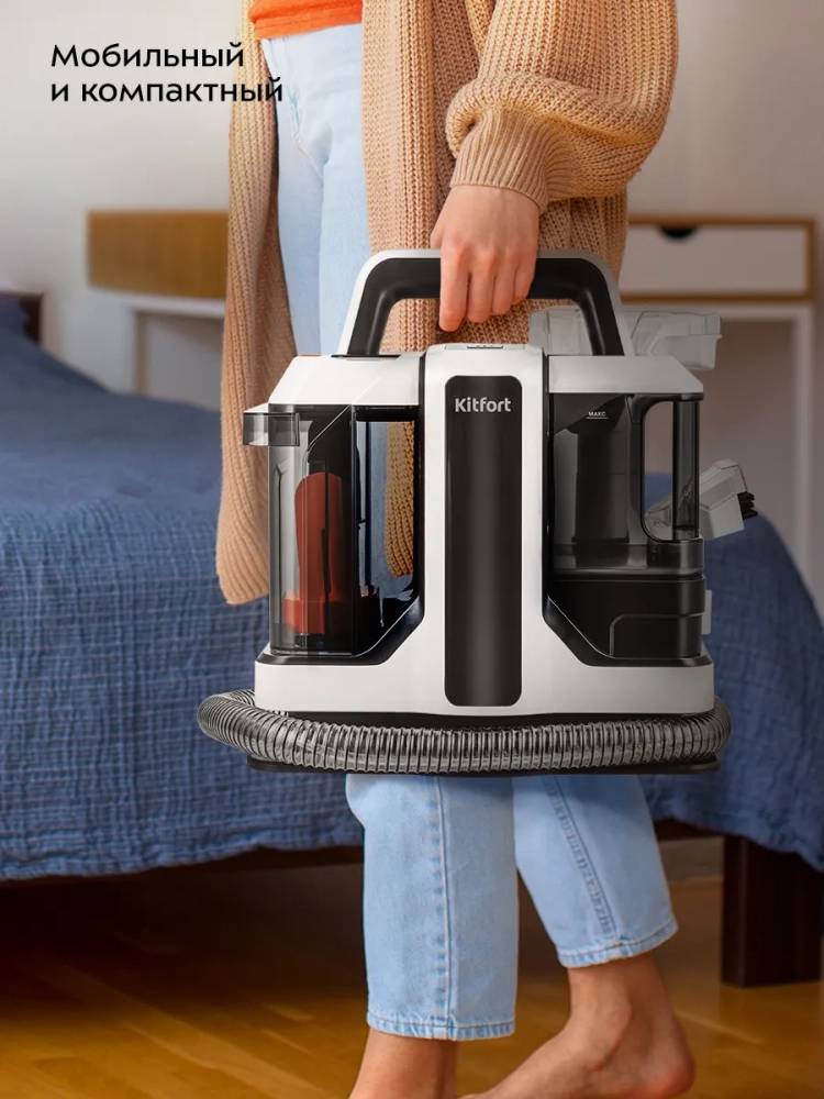 Моющий пылесос для ковров и мягкой мебели Kitfort KT-5299 поможет очистить обивку дивана, кресел, сидений в машине и другой мягкой мебели, а также ковры и ковровые покрытия. Пылесос автоматически подает чистую воду на очищаемую поверхность, а затем всасывает воду с пылью и другими загрязнениями. В резервуар для чистой воды можно добавлять воду или воду со специальным чистящим средством. В резервуаре для грязной воды предусмотрена защитная вставка с поплавком, который по мере наполнения резервуара поднимается. Когда резервуар для грязной воды наполнен выше максимально допустимого уровня, поплавок перекрывает всасывающее отверстие и защищает двигатель от попадания влаги. В таком случае вы заметите, что пылесос перестал всасывать жидкость. Отключите пылесос и вылейте грязную воду из резервуара.