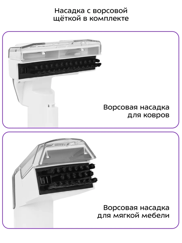 Благодаря небольшим размерам и весу моющего пылесоса его легко перемещать за ручку ближе к зоне уборки. В комплекте есть 2 насадки с ворсовой щеткой: большая и малая. Они хорошо подходят для очистки въевшихся загрязнений.