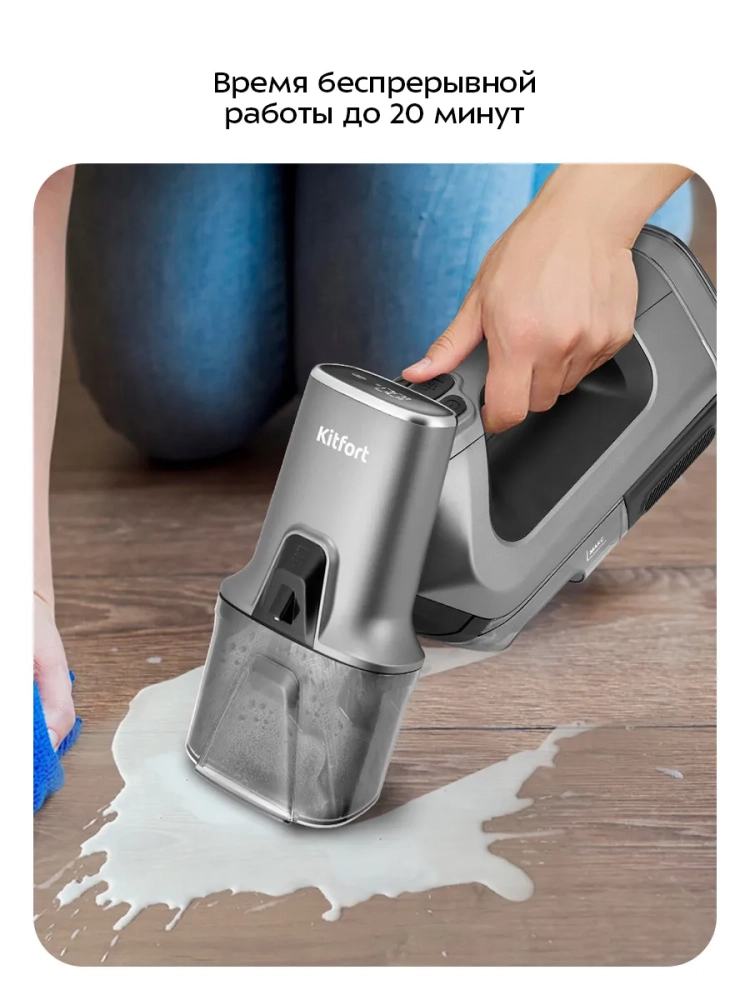 Беспроводной моющий пылесос для ковров и мягкой мебели Kitfort KT-5540 поможет очистить обивку дивана, кресел, сидений в машине и другой мягкой мебели, а также ковры и ковровые покрытия. Пылесос автоматически подает чистую воду на очищаемую поверхность, а затем всасывает воду с пылью и другими загрязнениями. Пыль и грязь оседают в воде в резервуаре для грязной воды. В резервуар для чистой воды можно добавлять воду или воду со специальным чистящим средством.