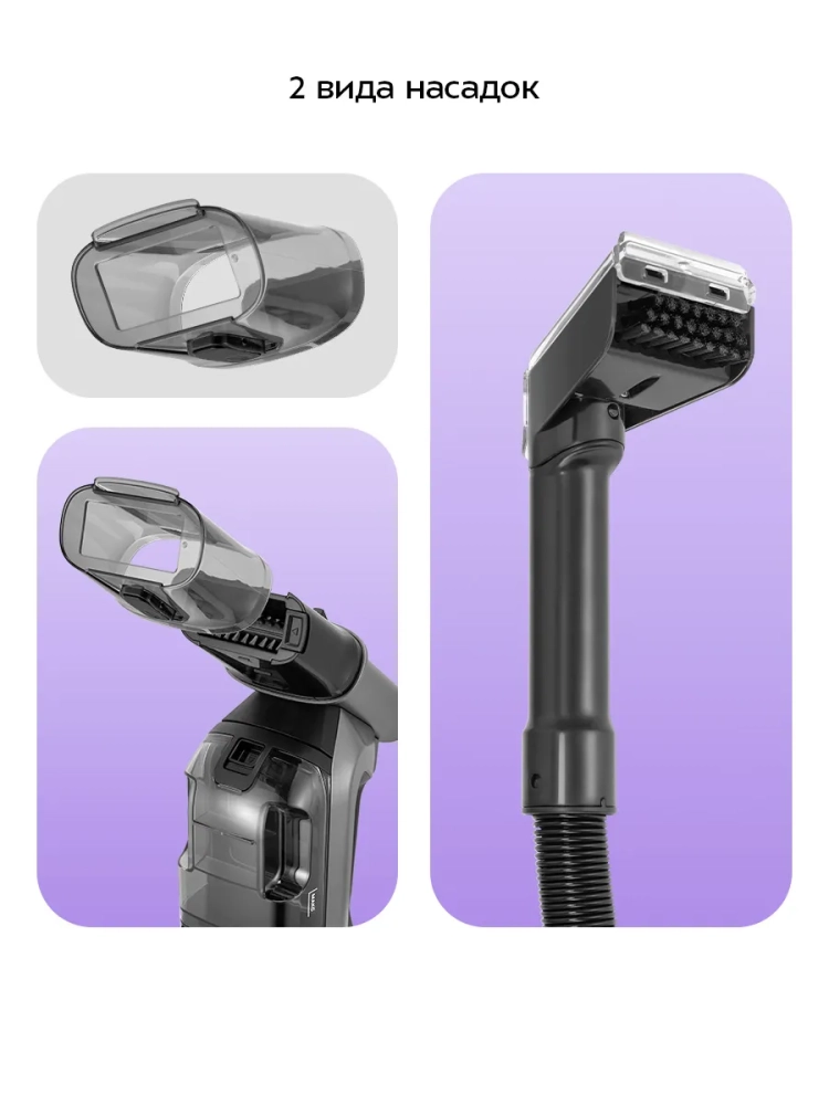 Пылесос удобно держать и перемещать за ручку во время уборки. В комплекте предусмотрено 2 насадки: мини-турбощетка и насадка с ворсовой щеткой. Они хорошо подходят для очистки мягкой мебели и ковровых покрытий от въевшихся загрязнений. Моющий пылесос нельзя наклонять вбок или переворачивать во время уборки, поэтому с мини-турбощеткой можно проводить уборку только горизонтальных поверхностей. Для насадки с ворсовой щеткой предусмотрен переходник со шлангом, поэтому она позволяет убирать вертикальные или наклонные поверхности, например спинку дивана или кресла. Также во время уборки с насадкой с ворсовой щеткой вы можете не держать пылесос, а положить его рядом с зоной уборки, предварительно распылив воду на зону уборки. Так ваши руки не будут уставать. Крышка насадки с ворсовой щеткой, крышка мини-турбощетки и резервуар для грязной воды выполнены из прозрачного пластика, поэтому в процессе уборки хорошо видно, как моющий пылесос всасывает грязную воду.