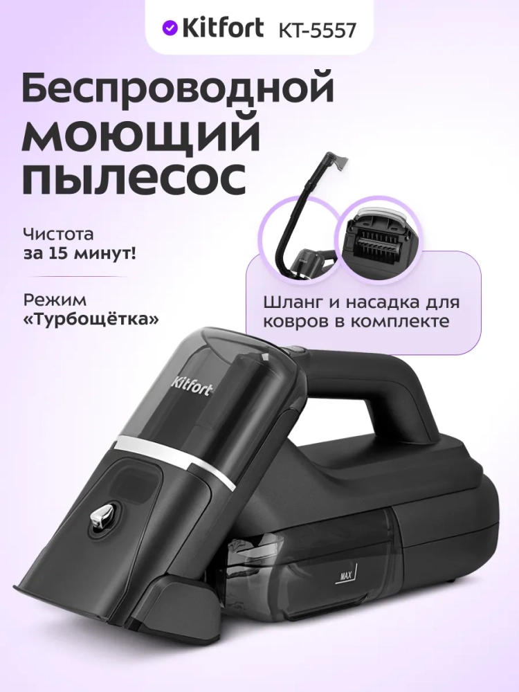 Беспроводной моющий пылесос для ковров и мягкой мебели Kitfort KT-5557 поможет очистить обивку дивана, кресел, сидений в машине и другой мягкой мебели, а также ковры и ковровые покрытия. Пылесос автоматически подает чистую воду на очищаемую поверхность, а затем всасывает воду с пылью и другими загрязнениями. Пыль и грязь оседают в воде в резервуаре для грязной воды. В резервуар для чистой воды можно добавлять воду или воду со специальным чистящим средством.