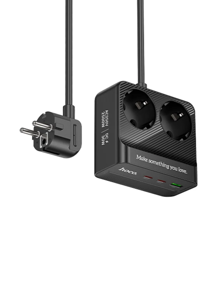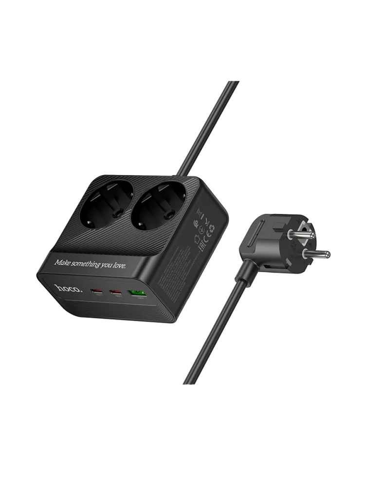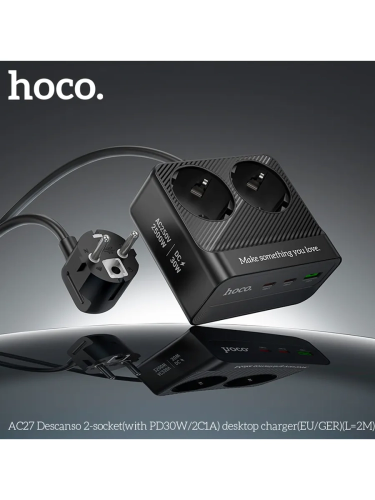 Hoco AC27 - это сетевой фильтр объединяющий в себе функции удлинителя с двумя розетками и блока зарядки для смартфонов и других гаджетов (оснащен 1-м USB выходом и 2-мя Type-C)