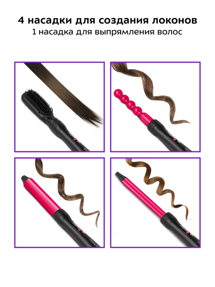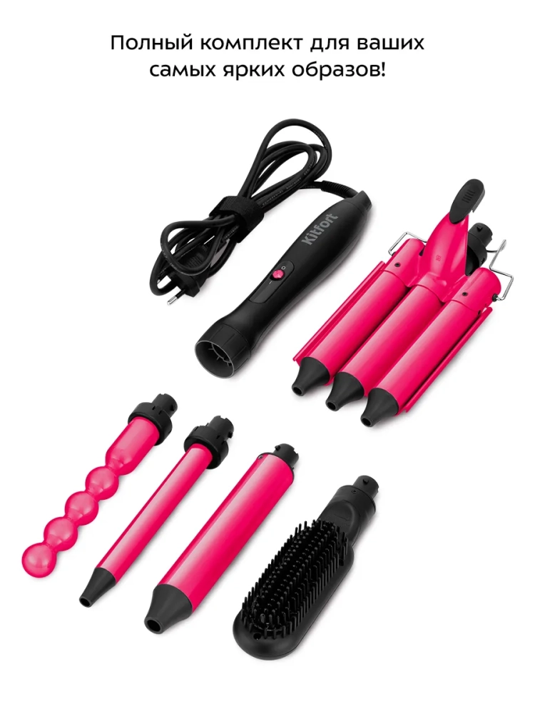 Мультистайлер Kitfort КТ-3284 предназначен для создания различных причесок путем завивки локонов разной формы и размера. В комплекте есть четыре насадки для создания локонов и насадка-расческа для выпрямления волос. Все насадки имеют керамическое покрытие, которое обеспечивает более щадящее воздействие на волосы, а также выравнивает структуру волос, делая их гладкими и блестящими.
