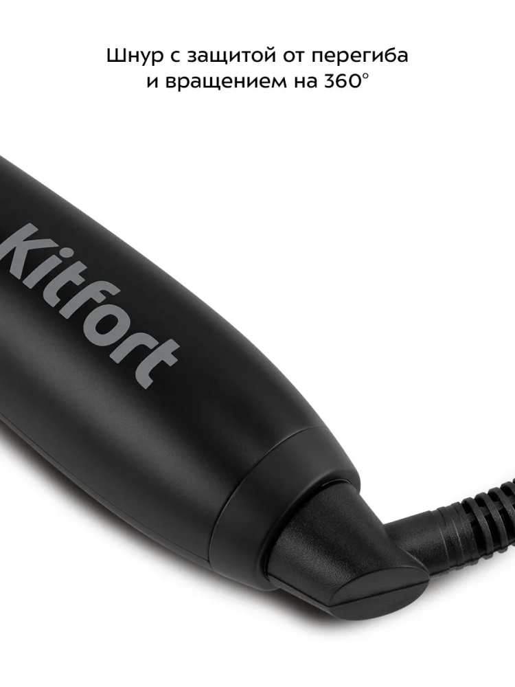 Шнур оснащен защитой от перегиба, что увеличивает срок службы прибора. Вращение шнура на 360° обеспечивает удобство в использовании мультистайлера — провод не сматывается и не путается при повороте устройства, а поворачивается вместе с ним.