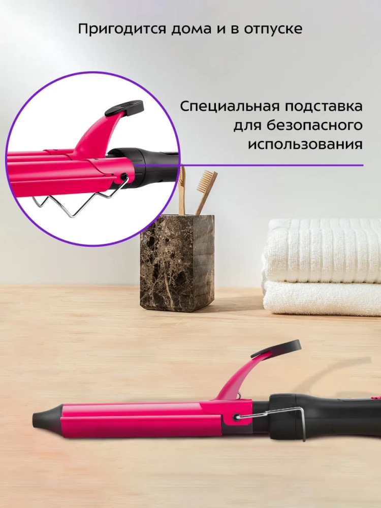 Устройство имеет функцию автоотключения через час работы. Также у тройной насадки есть специальная подставка, благодаря которой нагретая рабочая поверхность насадки не контактирует с поверхностью, на которую установлен мультистайлер. Это позволит вам не держать прибор с установленной тройной насадкой (которая достаточно тяжелая) в руках во время нагрева. Однако будьте внимательны, сама подставка тоже нагревается.