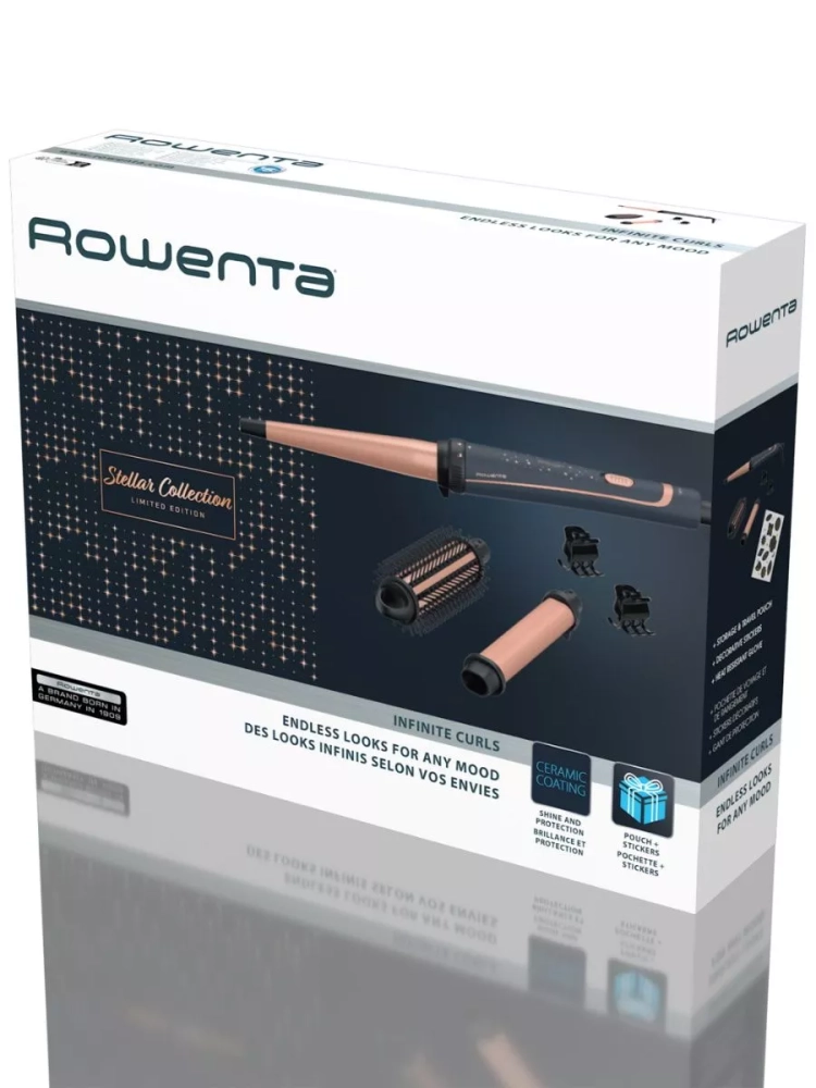 Мультистайлер Rowenta Infinite Curls Stellar Collection CF4211F0. Бесконечное разнообразие образов. Коллекция Stellar от Rowenta поднимет ваш ежедневный ритуал ухода за собой на новый уровень. Она не только обеспечит вам великолепный вид за считанные минуты, но и порадует особым, праздничным зимним дизайном.