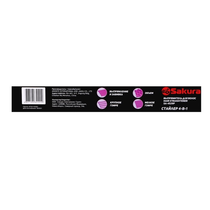 Мультистайлер Sakura SA-4529P, 38 Вт, керамическое покрытие, 180-210 °C, шнур 1.8, чёрный