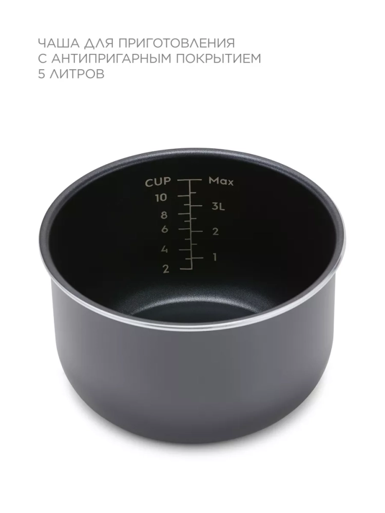 Лицензионное японское антипригарное покрытие DAIKIN не даст частичкам пищи и жира прилипнуть к поверхности чаши, а также делает ее легкой в очистке. Объём чаши составляет 5 литров, что позволит вам приготовить достаточно большое количество порций блюда. Рекомендуется использовать до 2/3 объема чаши.