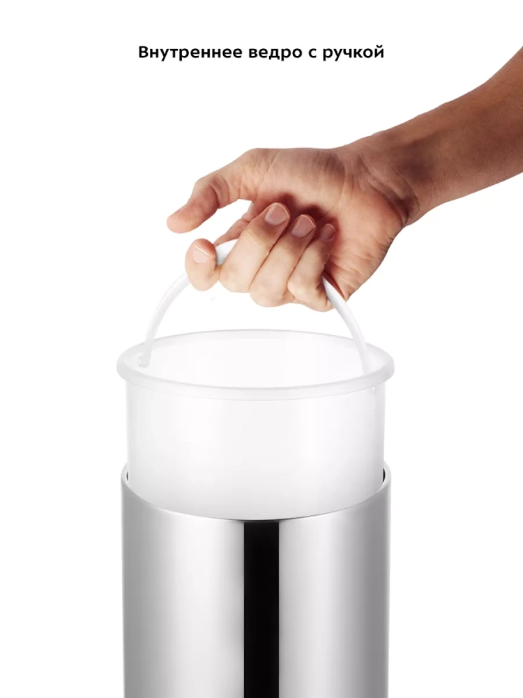 Внутри мусорного ведра находится маленькое внутреннее пластиковое ведерко с ручкой, которое легко очистить от мусора и помыть при необходимости. Устройство работает от 3 батареек типа ААА, которых хватает на долгое время. Батарейки в комплект не входят.