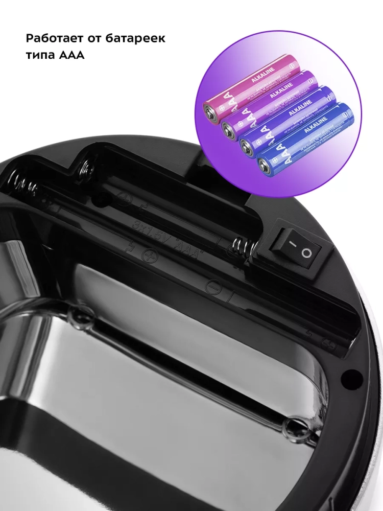 Внутри мусорного ведра находится маленькое внутреннее пластиковое ведерко с ручкой, которое легко очистить от мусора и помыть при необходимости. Устройство работает от 3 батареек типа ААА, которых хватает на долгое время. Батарейки в комплект не входят.