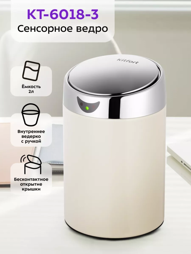 Сенсорное мусорное ведро Kitfort КТ-6018 — это компактная настольная корзина для мусора с функцией бесконтактного открытия крышки. Его удобно поставить на рабочее место, компьютерный или письменный стол и выбрасывать мелкий мусор, который может появляться во время работы.