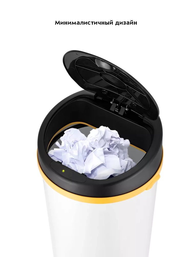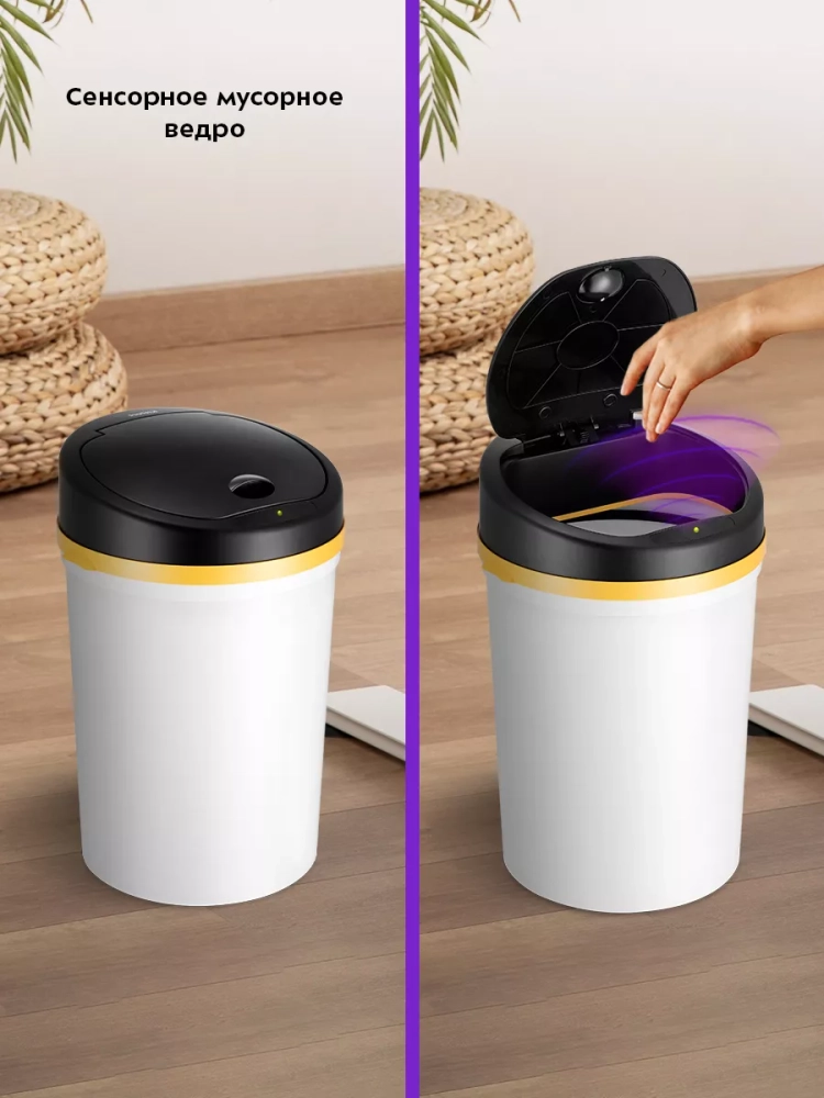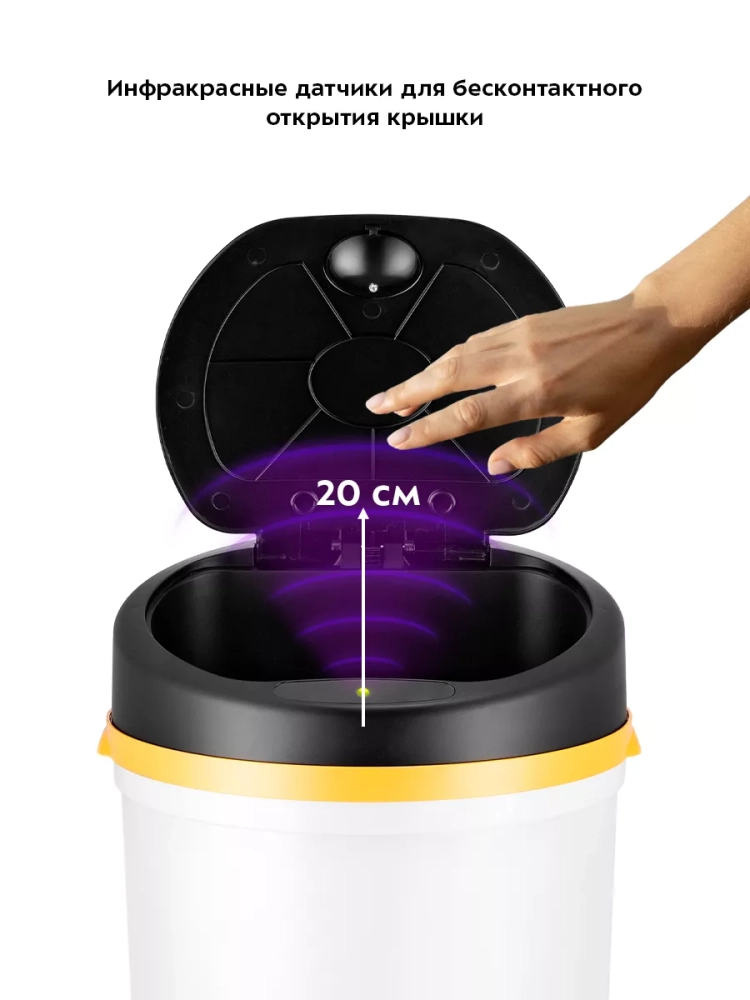 Сенсорное мусорное ведро оснащено инфракрасными датчиками. Такое ведро открывается и закрывается автоматически и его не нужно касаться при выбрасывании мусора. Датчики ведра КТ-6020 расположены на крышке. Когда объект появляется в зоне действия датчиков — откидная крышка ведра автоматически открывается и закрывается через 6 секунд. На крышке также есть небольшая ручка. При желании можно отключить датчики и пользоваться устройством КТ-6020 как обычным мусорным ведром.