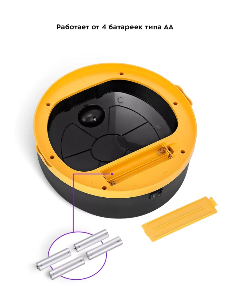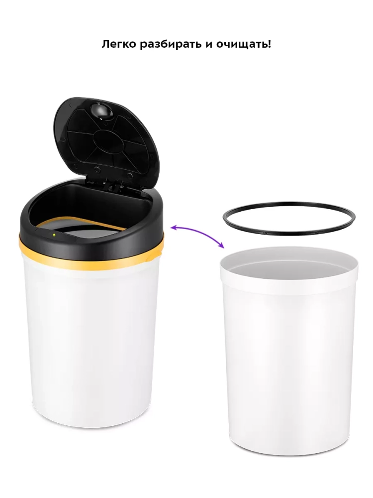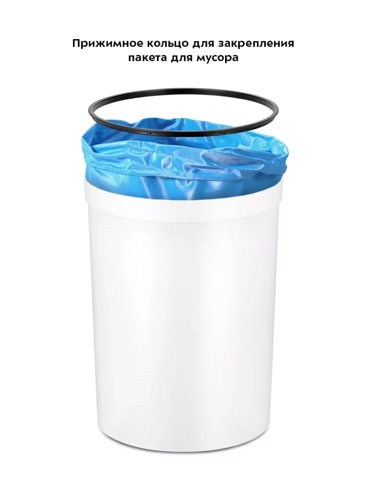 Внутри мусорного ведра находится прижимное кольцо, благодаря которому удобно закреплять в ведре пакеты для мусора. Устройство работает от 4 батареек типа АА, которых хватает на долгое время. Батарейки в комплект не входят.