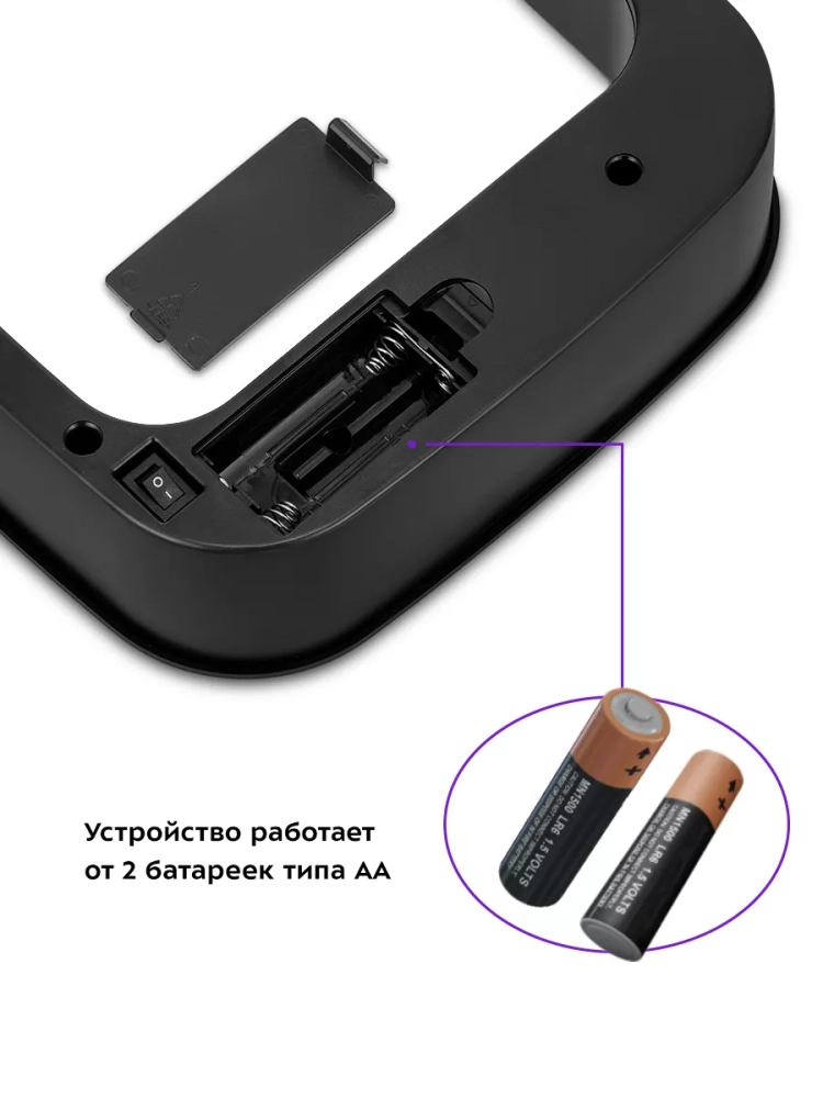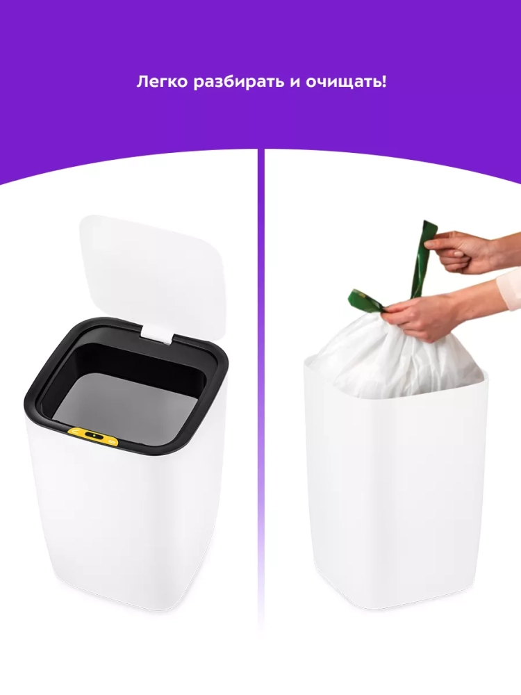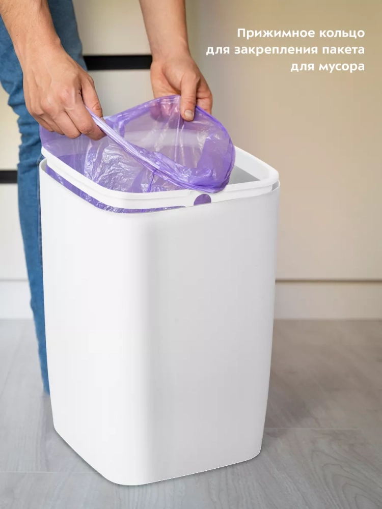 Внутри мусорного ведра находится прижимное кольцо, благодаря которому удобно закреплять в ведре пакеты для мусора. Устройство работает от 2 батареек типа АА, которых хватает на долгое время. Батарейки в комплект не входят.