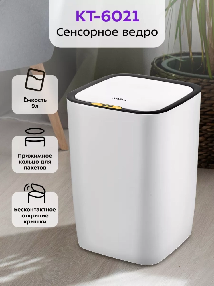 Сенсорное мусорное ведро Kitfort КТ-6021 — это компактная корзина для мусора с функцией бесконтактного открытия крышки. Его удобно поставить в кабинет, в комнату или в санузел, чтобы выбрасывать мелкий мусор.