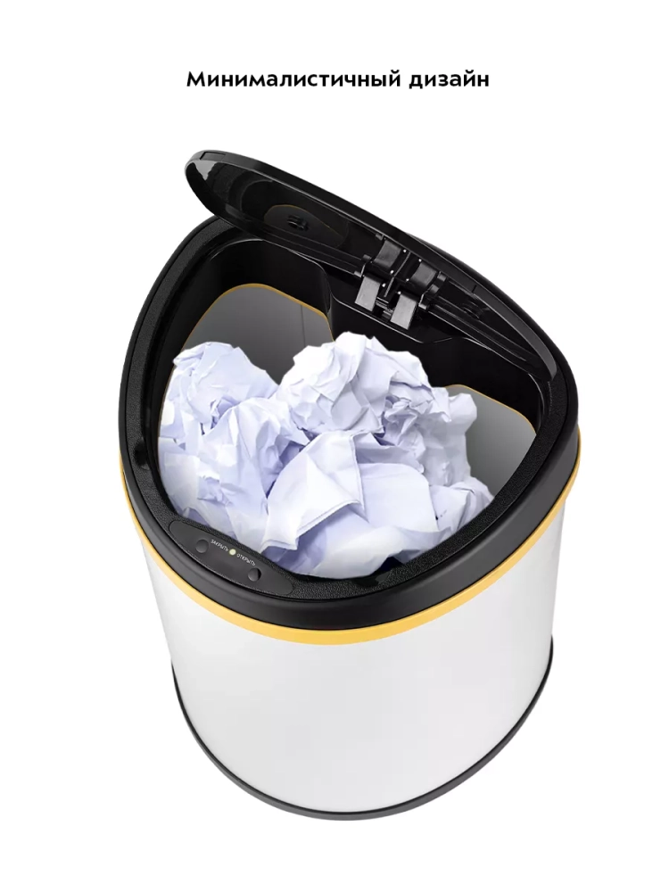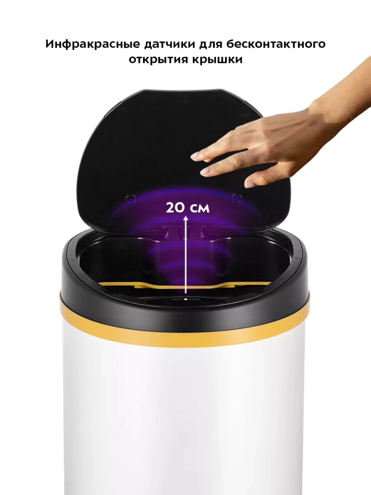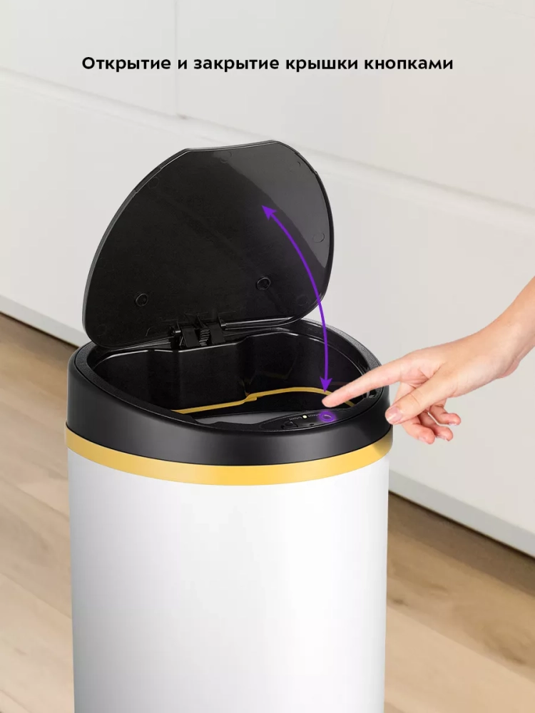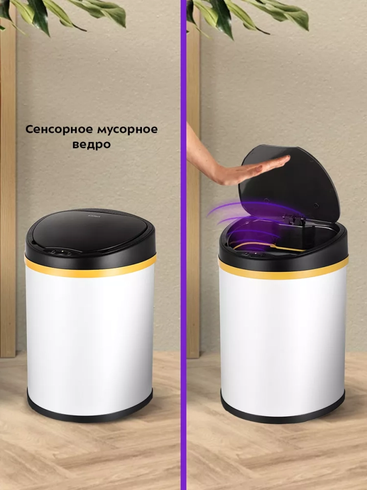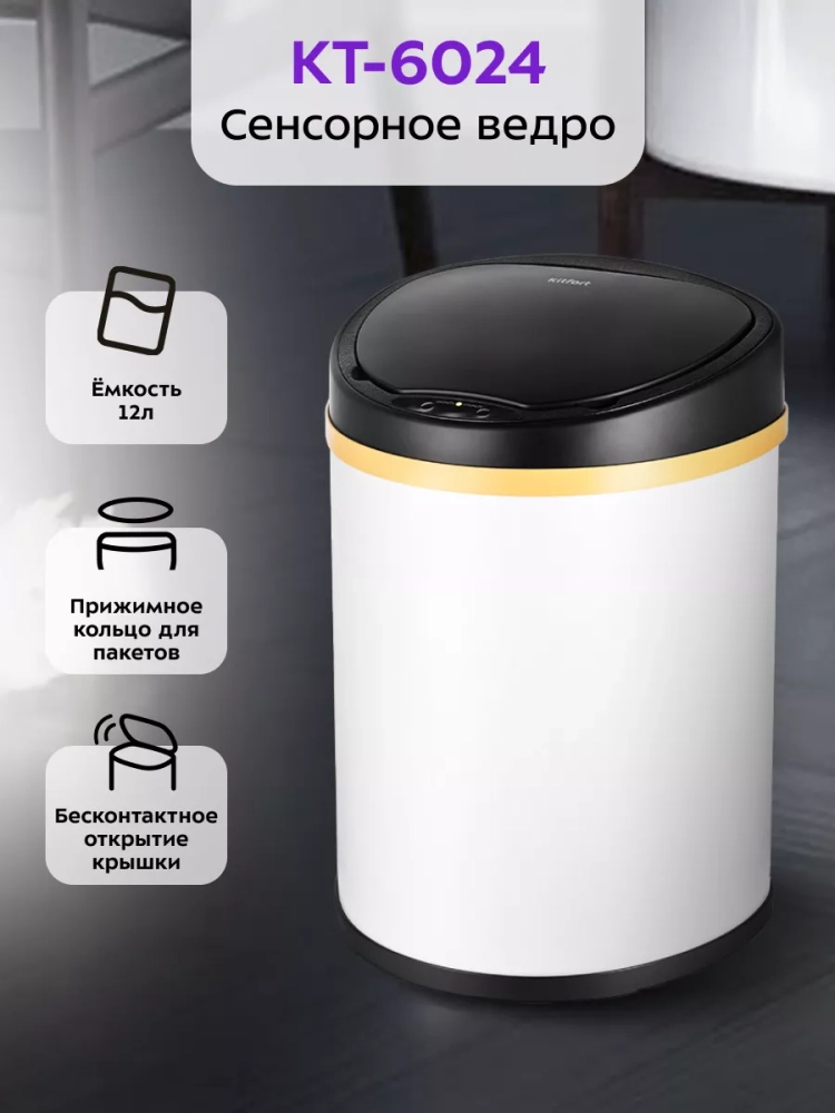 Сенсорное мусорное ведро оснащено инфракрасными датчиками. Такое ведро открывается и закрывается автоматически, и его не нужно касаться при выбрасывании мусора. Датчики ведра КТ-6024 расположены на крышке сверху. Когда объект появляется в зоне действия датчиков — откидная крышка ведра автоматически открывается и закрывается через 5 секунд. Также эта модель оснащена кнопками для открытия и закрытия крышки. Если откидная крышка была открыта нажатием на кнопку, она автоматически закроется через 80 секунд.