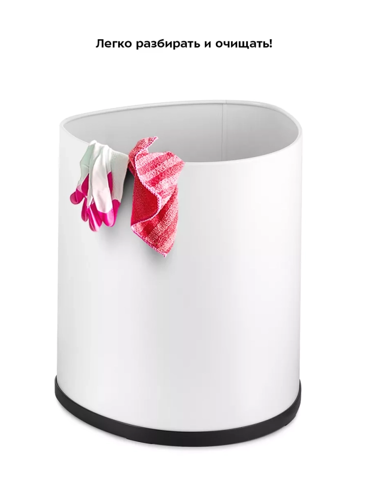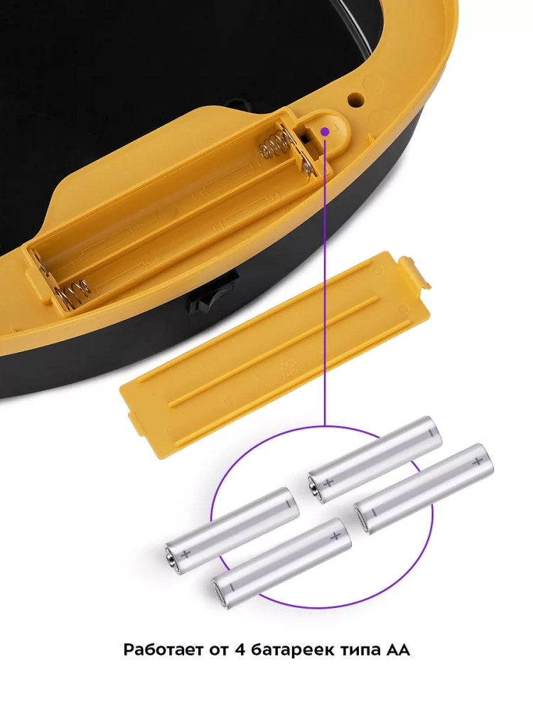 Внутри мусорного ведра находится прижимное кольцо, благодаря которому удобно закреплять в ведре пакеты для мусора. Устройство работает от 4 батареек типа АА, которых хватает на долгое время. Батарейки в комплект не входят.