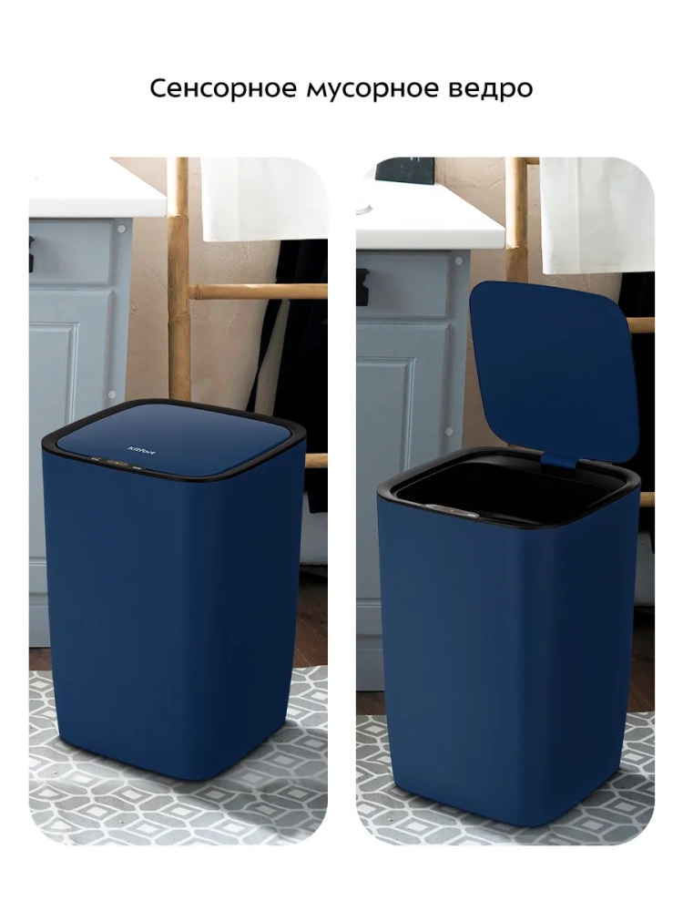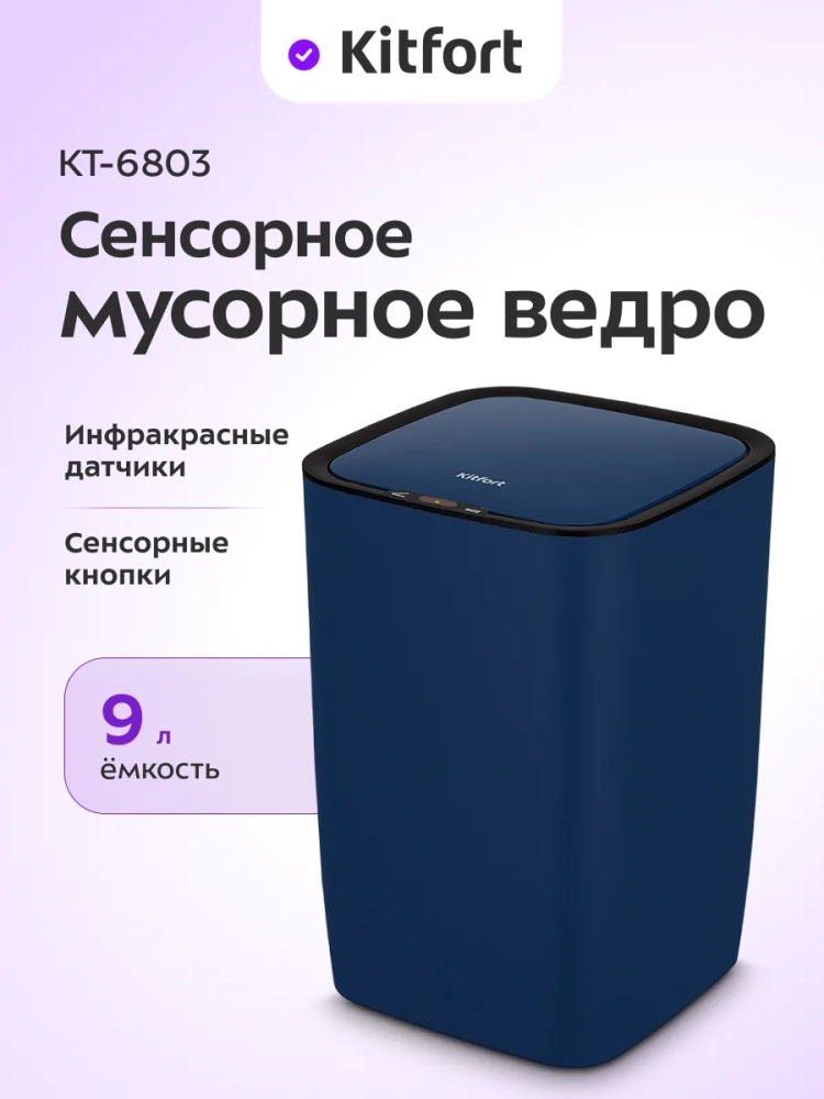 Сенсорное мусорное ведро оснащено инфракрасными датчиками. Такое ведро открывается и закрывается автоматически и его не нужно касаться при выбрасывании мусора. Датчики ведра КТ-6803 расположены на крышке сверху. Когда объект появляется в зоне действия датчиков — откидная крышка ведра автоматически открывается и закрывается через 5 секунд. Также эта модель оснащена сенсорными кнопками для открытия и закрытия крышки. Если откидная крышка была открыта нажатием на кнопку, она автоматически закроется через 1,5 минуты.