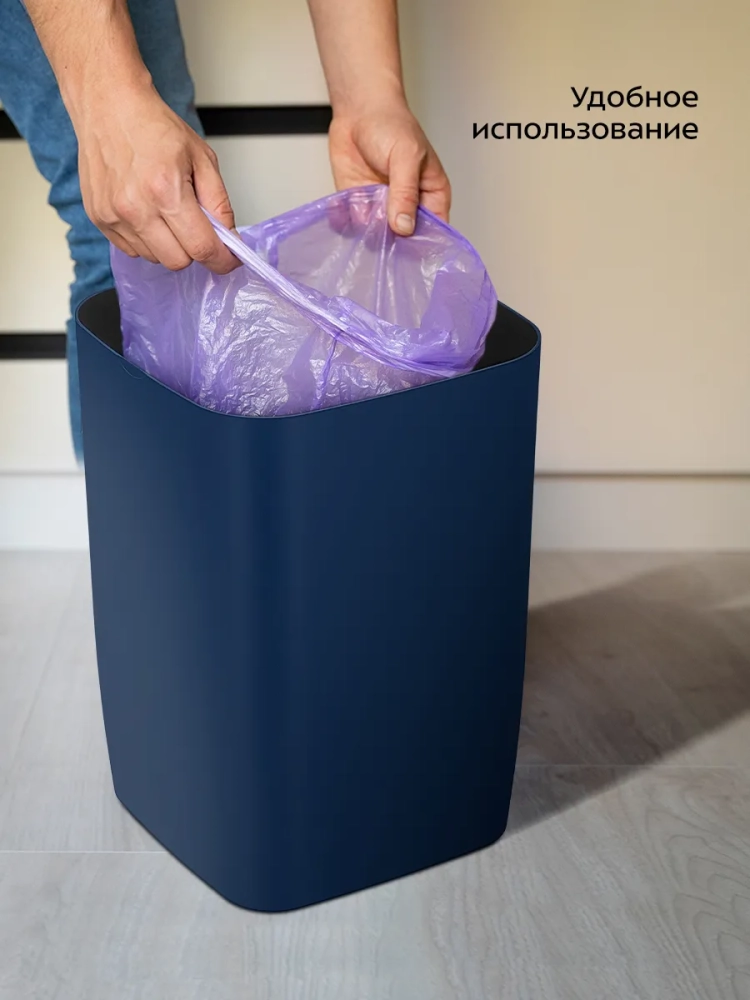 Внутри мусорного ведра находится прижимное кольцо, благодаря которому удобно закреплять в ведре пакеты для мусора. Устройство работает от 2 батареек типа АА, которых хватает на долгое время. Батарейки в комплект не входят.