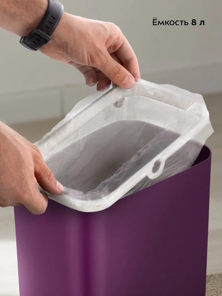 Внутри мусорного ведра находится прижимное кольцо, благодаря которому удобно закреплять в ведре пакеты для мусора. Устройство работает от 2 батареек типа АА, которых хватает на долгое время. Батарейки в комплект не входят.