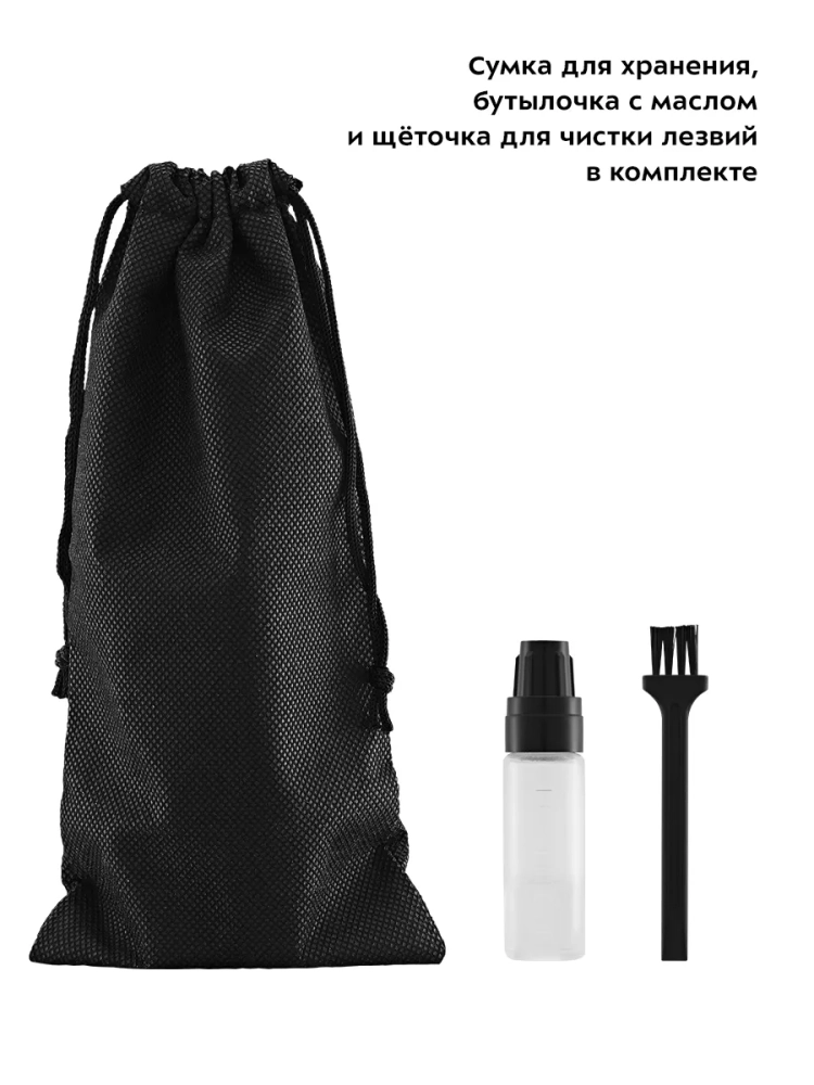 В комплекте к триммеру идет щеточка для чистки лезвий и бутылочка с маслом. С помощью этих аксессуаров вы можете с легкостью ухаживать за триммером и поддерживать его в чистоте и исправном состоянии. В комплекте предусмотрен защитный колпачок на лезвия, чтобы во время хранения случайно не повредить их.